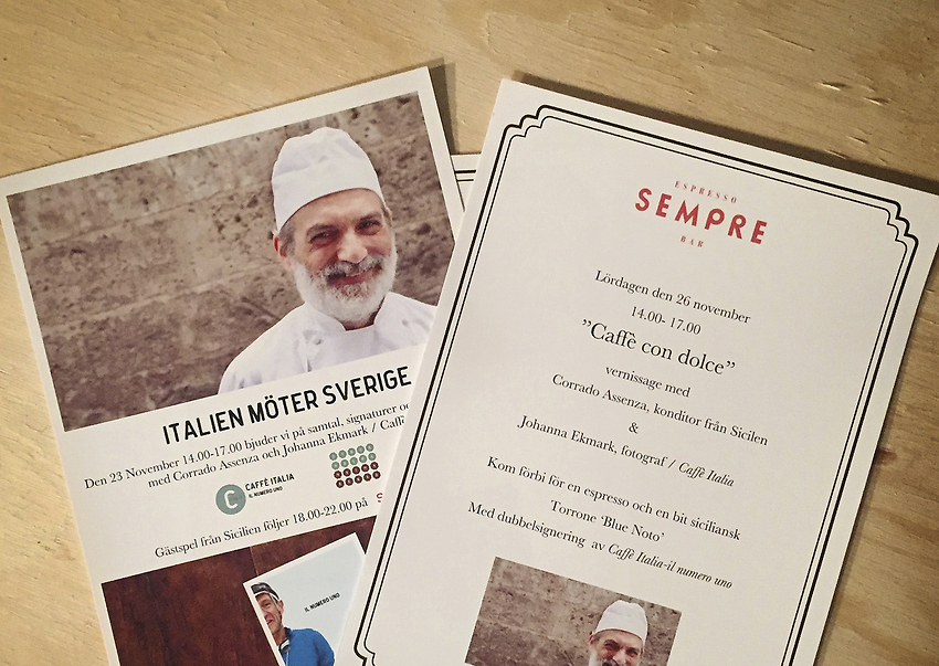 In November 2016 Caffè Italia made a five day event in Stockholm, during which Caffè Italia brought world renowned Sicilian chef Corrado Assenza to town during "the Extraordinary taste of Italy". He was Guest chef at Sturehof and, on the same day, we presented Caffè Italia and Corrado Assenza to the public with tasty appetizers at Stockholms Matmarknad. An evening at L'istituto Italiano di Cultura followed, as well as a meeting with Mathias Dahlgren and his staff, together with Svenska Bin. We even managed to meet for a coffee and sweets at Sempre Espresso Bar before Corrado prepared a Gala Dinner at the Italian Embassy!