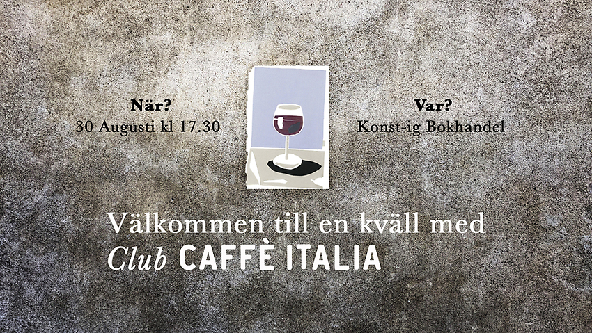 Would you like to buy a copy of Caffe Italia-il numero uno? Take advantage of our discounted rate when you register: 375 kr for the evening's wine tasting + il numero uno sent home to you via post (only for Swedish residents). Swish the sum along with your email address and home address in the message or send an email to club@caffeitalia.se with your address and phone number after payment. Caffe Italia-il numero uno will also be available for purchase at Konst-ig, at a 10% discount during the evening (full price 325 kr).